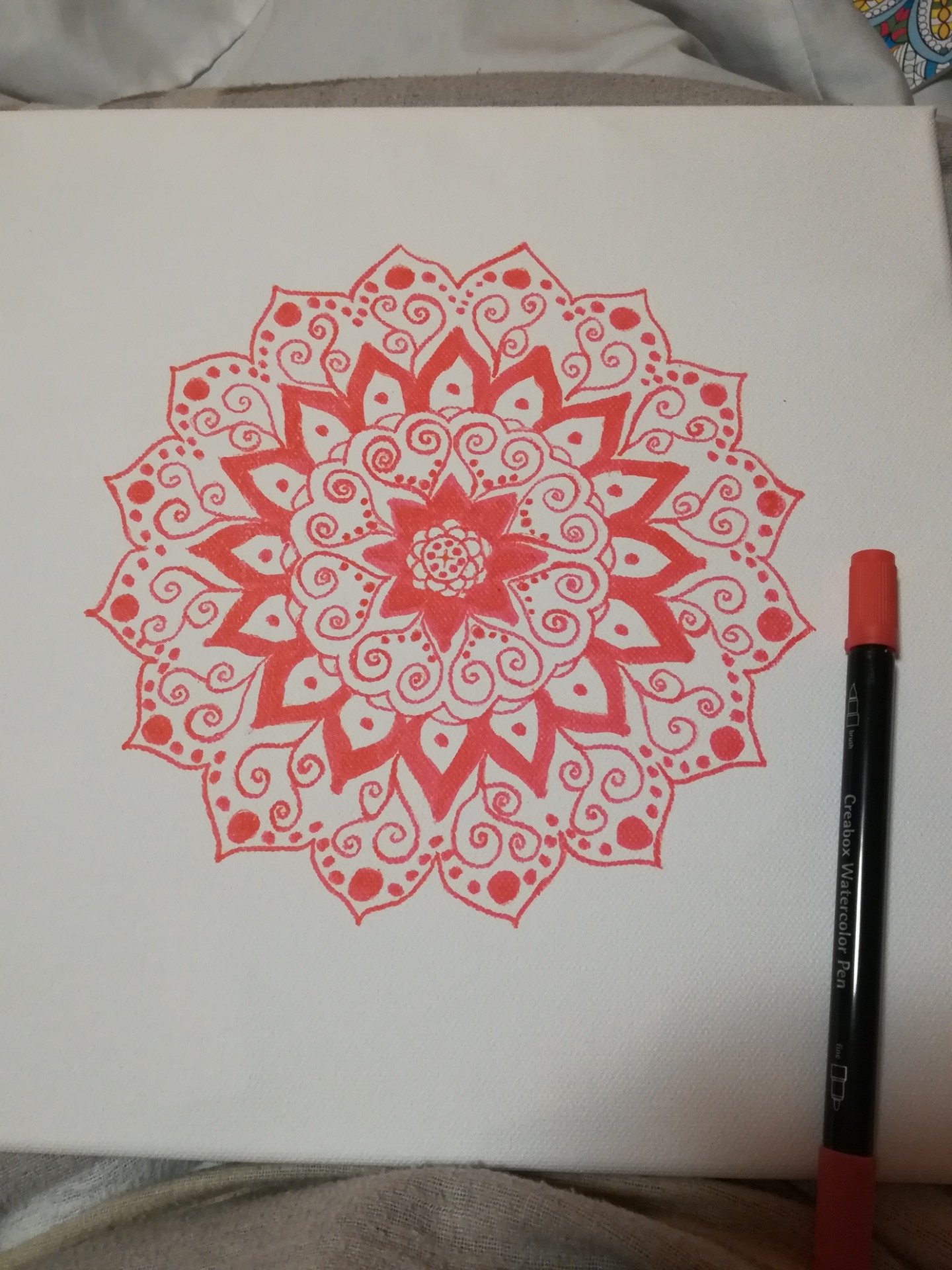 Megint elhanyagoltam a blogolást, de annyira sok dolgom van, hogy mostanában szelektál az agyam. (Mindig elfelejtem..) Újabb mandala készült el. A vicces az, hogy nem kedvelem a piros színt. Hiába a szerelem színe, vagy a tűz melengető színe. Mindig megcsodálom másokon a piros színű ruhákat, kiegészítőket, körmöket. Ám jómagam nem kedvelem annyira. Azt hiszem a piros szín viselői abszolút magabiztos emberek, akik céltudatosak és törtetőek, vagyis tudják, hogy mi kell neki, és azért a végsőkig képes harcolni. Na ezt irigylem, az ilyen típusú embereket. Akik mindenkin átgázolnak gátlástalanul nem törődve mások valódi érzéseivel. Azt elmondhatjuk, hogy az én lelkem ennek szöges ellentéte. Talán éppen ezért volt kihívás megalkotni a kék szín ellentétes pólusát a pirosat vagy inkább vöröset. Imádom a magyar nyelvet, hogy ebben is különbséget tesz, mert a piros, mint az alma egy átlagos szín, de vörös, az olyan misztikus, titokzatos, tüzes szín, amiben van spiritusz.